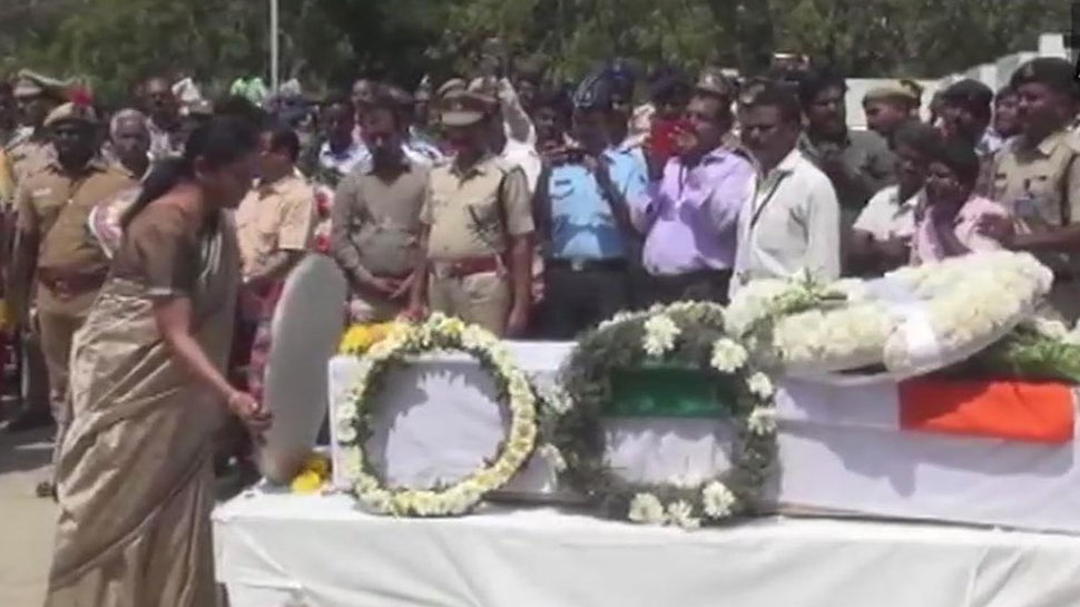 रक्षा मंत्री निर्मला सीतारमण ने तिरुचिरापल्ली में सीआरपीएफ के शहीद कांस्टेबल सी शिवचंद्रन को श्रद्धांजलि अर्पित की. फोटो ANI