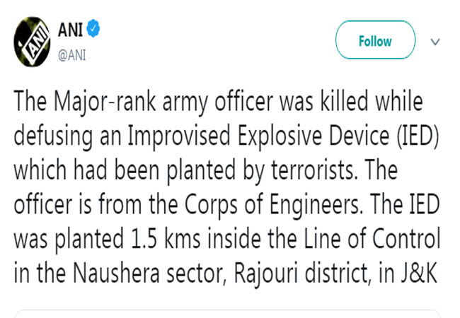 राजौरी, एएनआइ। जम्मू-कश्मीर के राजौरी जिले में नियंत्रण रेखा के पास बम धमाके में सेना का एक मेजर शहीद हो गया है। यह घटना नौशेरा सेक्टर की है। बताया जा रहा है कि मेजर आतंकियों द्वारा लगाए गए इम्प्रोवाइज्ड एक्सप्लोसिव डिवाइस (IED) को डिफ्यूज कर रहे थे इसी दौरान ब्लास्ट हो गया। यह IED अंतरराष्ट्रीय सीमा के 1.5 किलोमीटर अंदर लगाया गया था।
